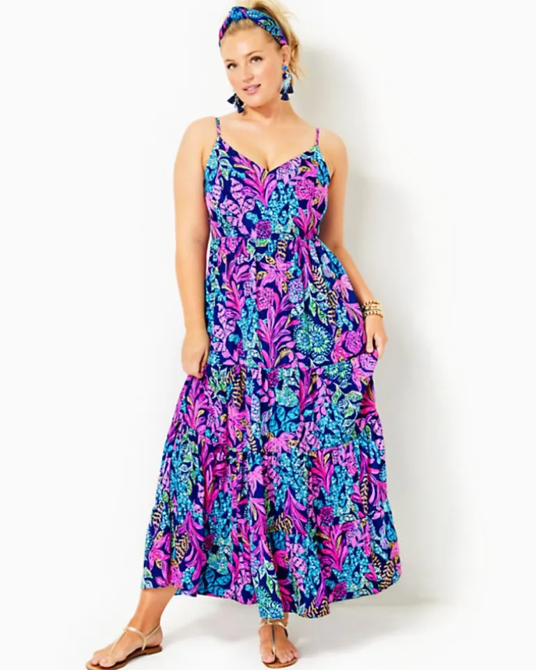 - Fit-And-Flare Maxi With Adjustable Spaghetti Straps, Bodice Cups, Smocked Back Panel, Tiered Skirt, And Side Seam Pockets.