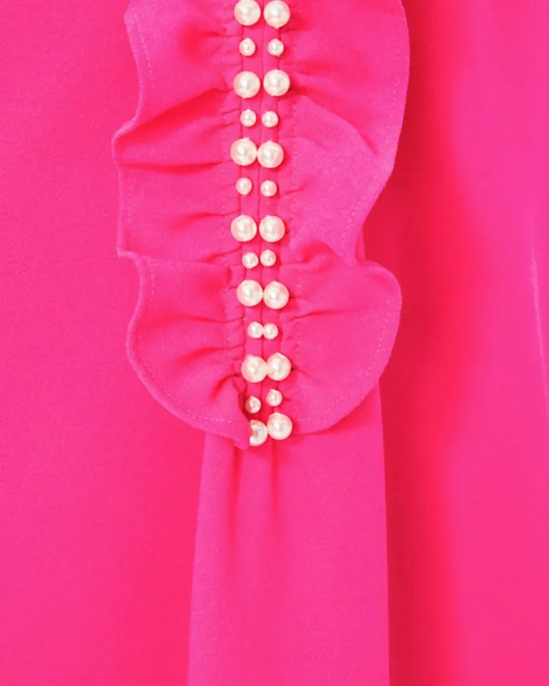 - Easy Fit, Soft Shift Dress With Stand Collar, Ruffle Detail, Center Front Zipper, And Pearl Beads.