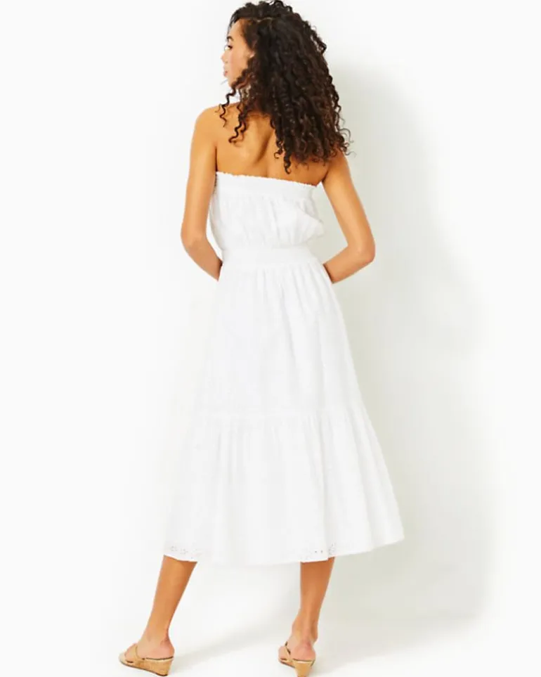 Airy White Eyelet Makes The Nikole Dress A Summertime Staple, Whether You’Re Heading To The Beach Or To Dinner Al Fresco. This Strapless Midi Offers An Easy Fit With Smocking At The Neckline And Waist, Plus A Tall Ruffle Hem.