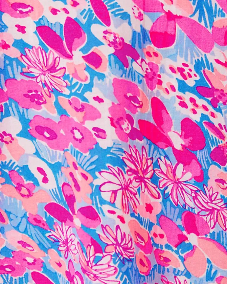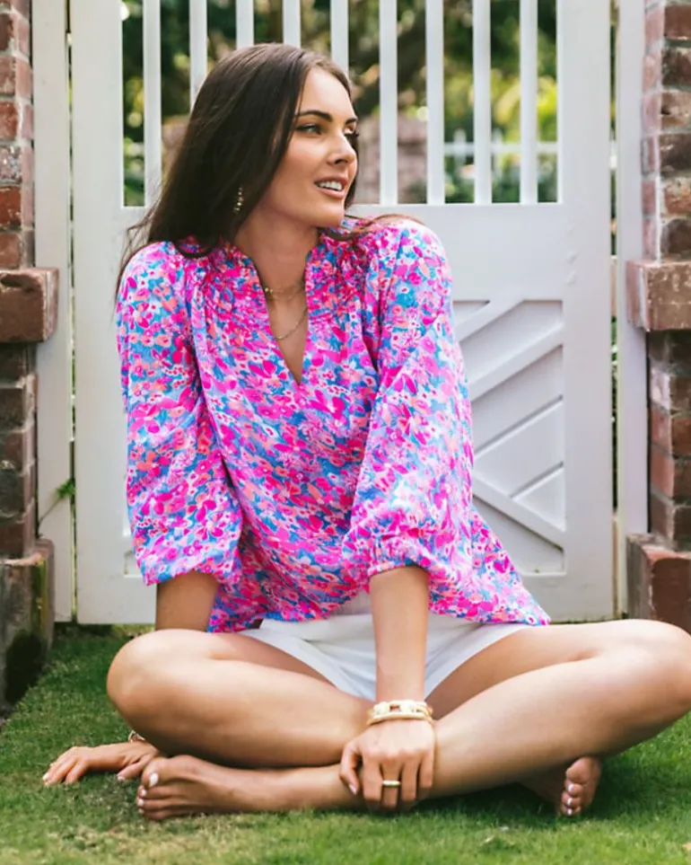 Printed Cotton Blend Lawn Fabric And An Easy Silhouette Give The Lourdes Top Its Airy Appeal, While A Ruffle Collar, Full 3/4 Sleeves, And Pop Color Smocking Add Delightful Detail.