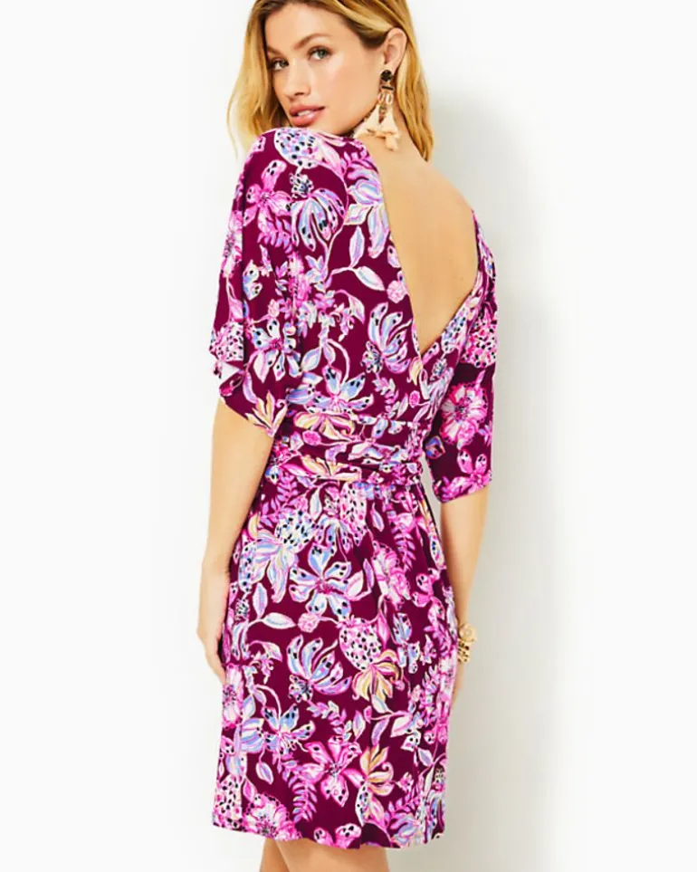 - Skirted Romper With Boat Neckline, Elbow-Length Kimono Sleeves, And Ruched Waistband.
