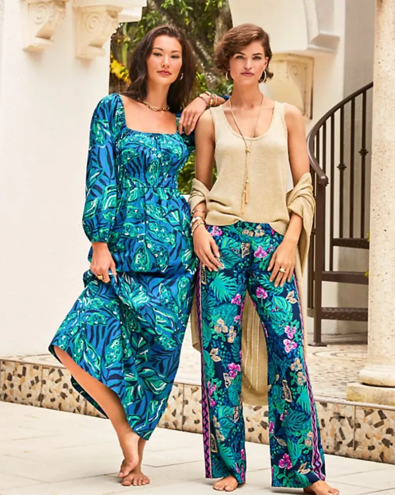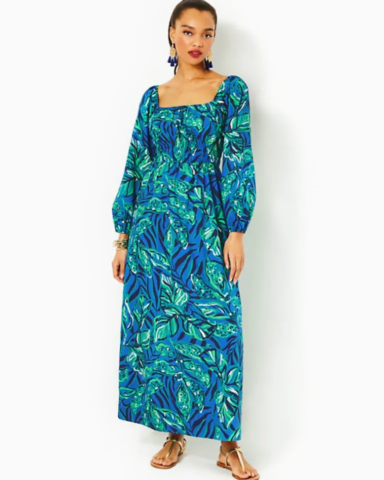 - Easy Fit, Ankle-Length Maxi Dress With A Square Neckline, Elastic Detail At Waist, 3/4 Length Sleeves With Elastic Cuffs, And Side Seam Pockets.
