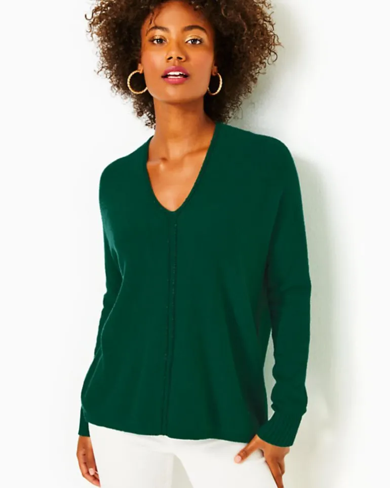- Easy Fit, Dolman Sleeve, V-Neck Sweater With Metallic Accents.