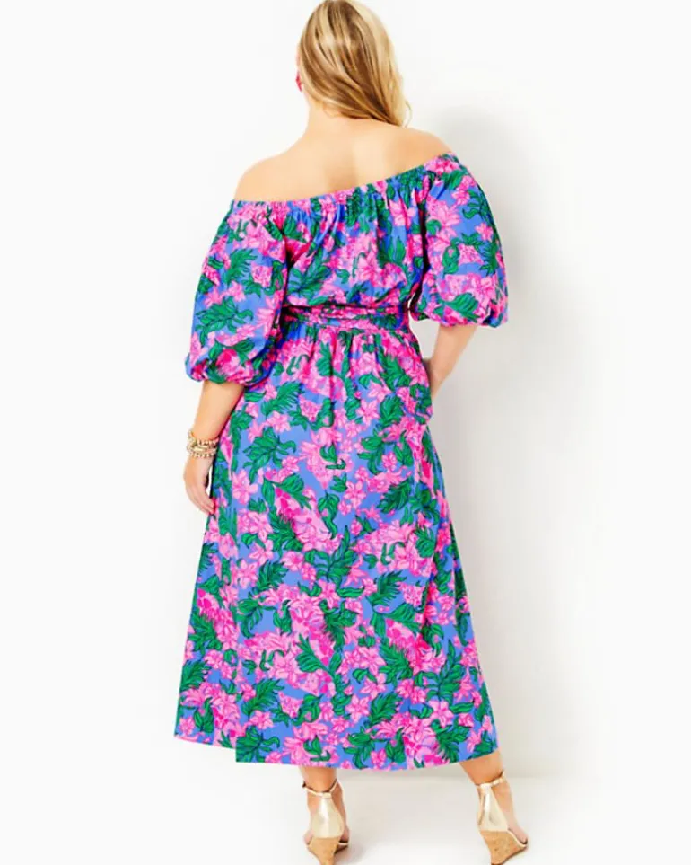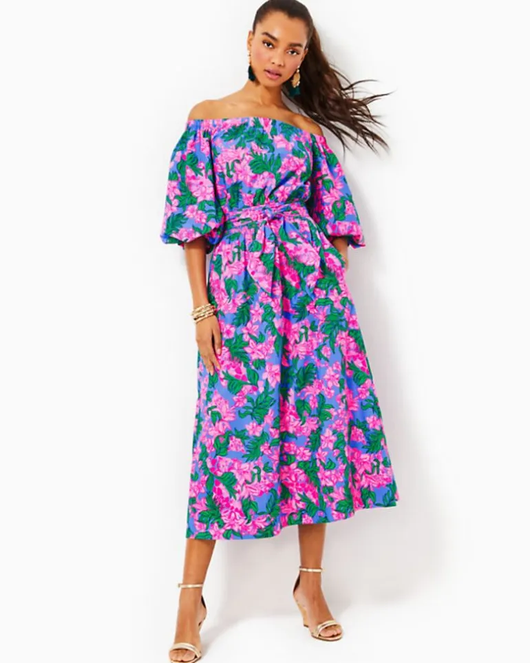 Made From Cotton Poplin That Beautifully Showcases Its Vibrant Print, The Shawnlee Dress Is An Off-The-Shoulder Midi Style With An Easy Fit. Full, Elbow-Length Sleeves, A Smocked Waist With A Separate Sash, And Side Seam Pockets Round Out The Design.