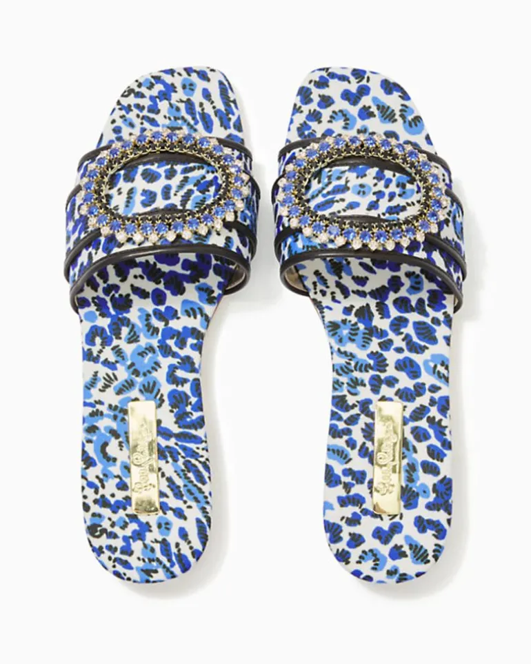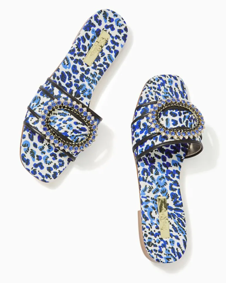 A Glittering Embellished Buckle Tops Off The Dayna Sandal, A Sleek Slide In Printed Sateen.