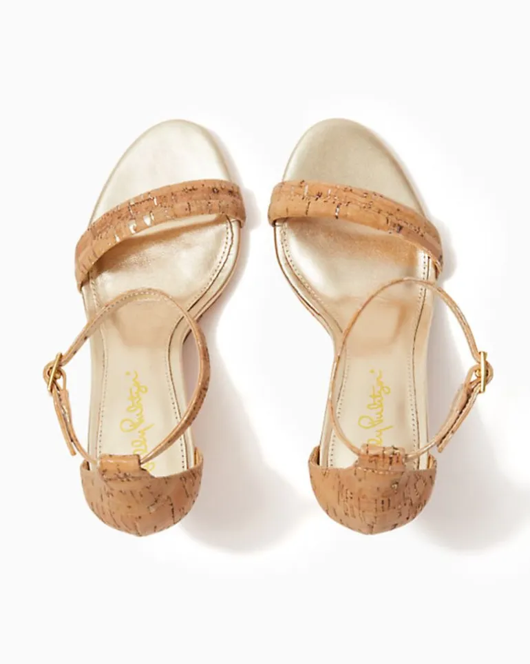 - Metallic Flecked Cork Ankle Strap Sandal And Wrapped Heel Wedge.