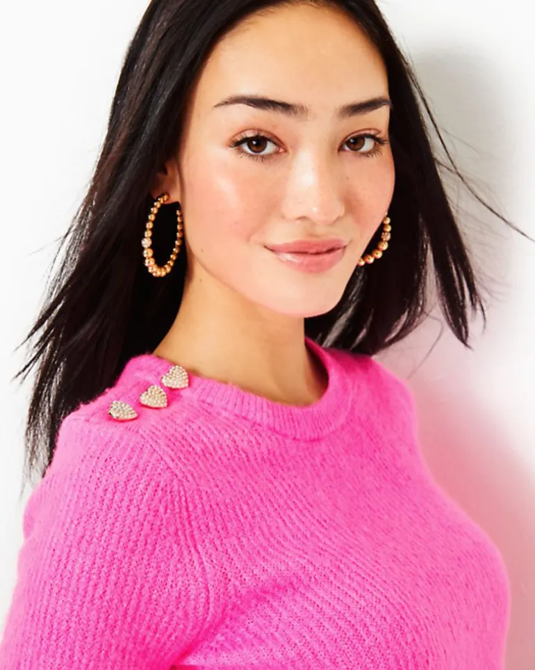 - Straight Fit, Long Sleeve, Crew Neck Pullover With Three Rhinestone Heart Buttons At Shoulder.