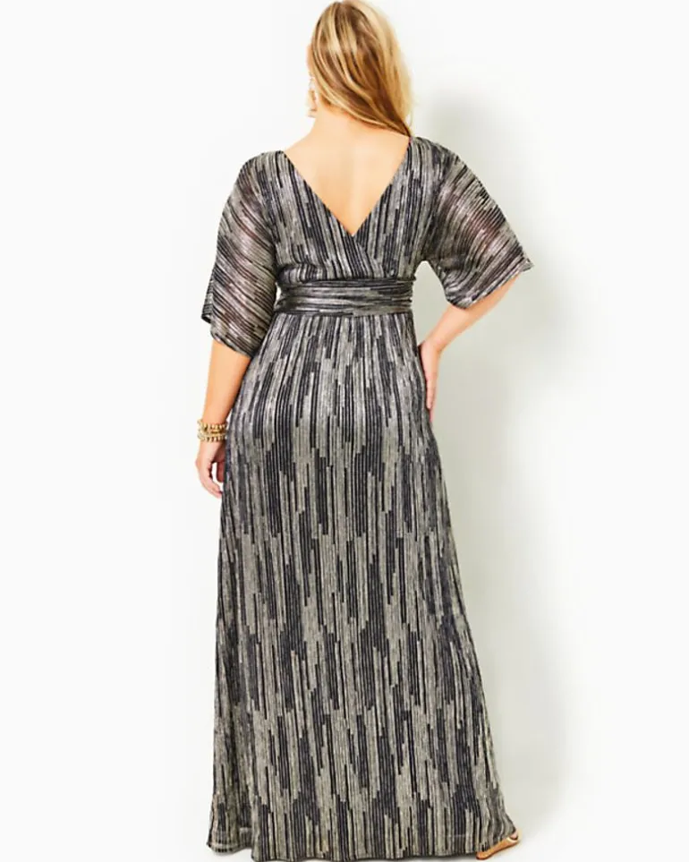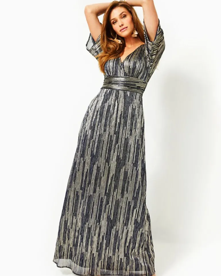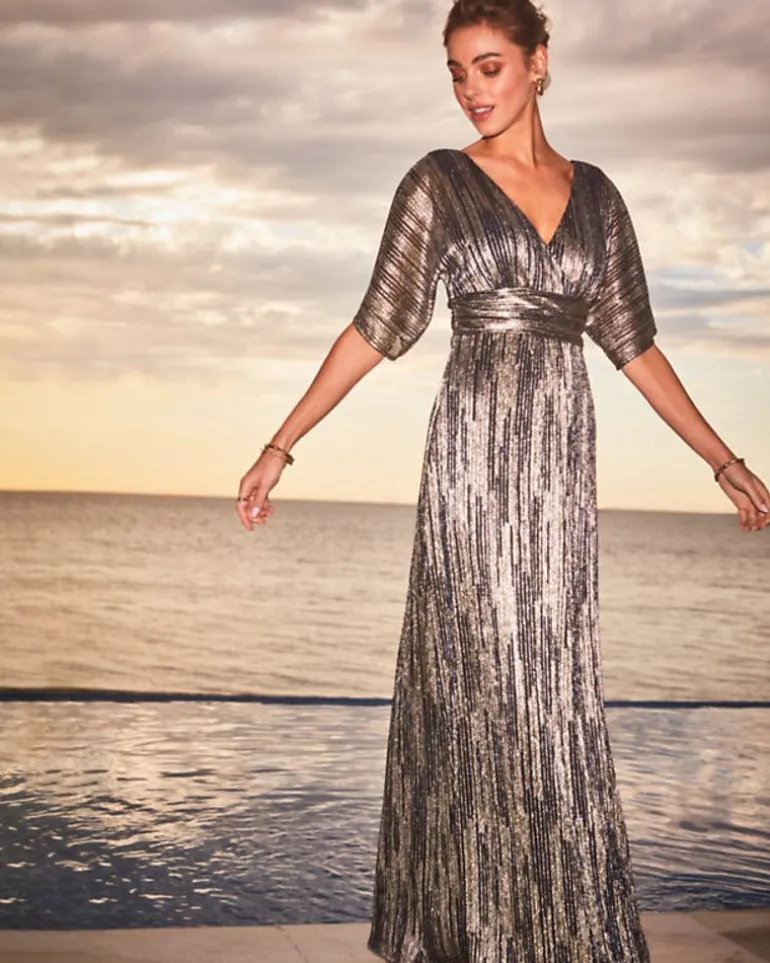 Go Glam In The Parigi Maxi Dress, Our Must-Have Style For All The Season’S Special Occasions. Its Metallic Crinkle Knit Fabric Balances Ease And Elegance, While The Surplice Neckline, Ruched Waistband, And Elbow-Length Kimono Sleeves Create A Graceful Silhouette. The Skirt Is The Perfect Length To Pair With Your Favorite Heels For Nights On The Town.