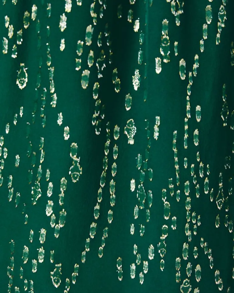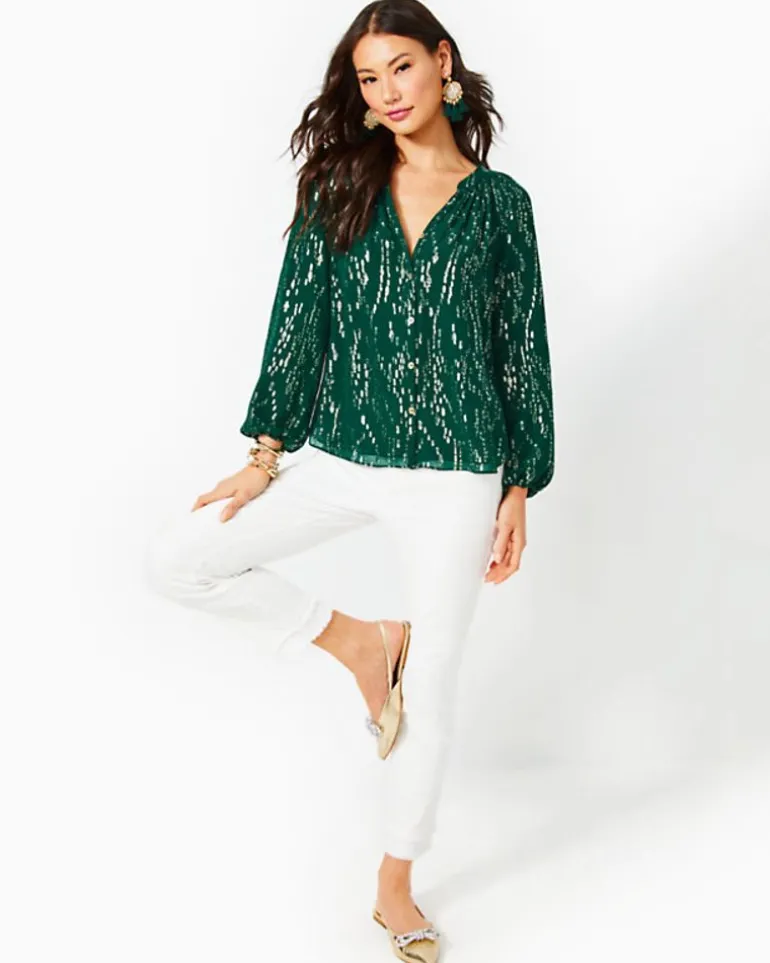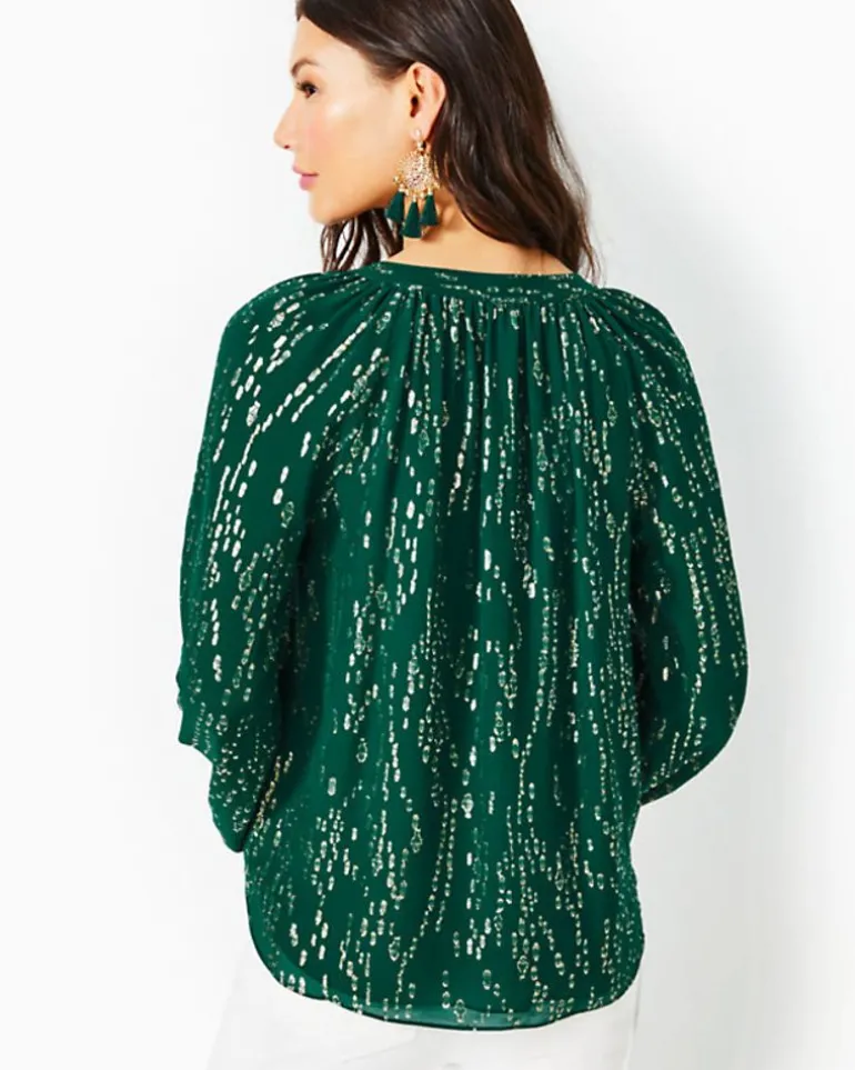 Silk Chiffon Dusted With Metallic Details Makes The Saige Top An Elegant Addition To Your Wardrobe. This Flowy Button-Front Style Features A Notch Neckline, Sheer Full Sleeves, And A Curved Hem.