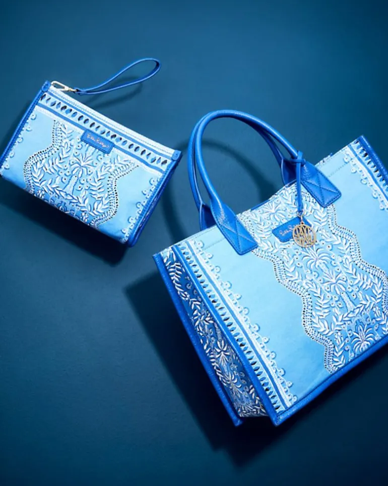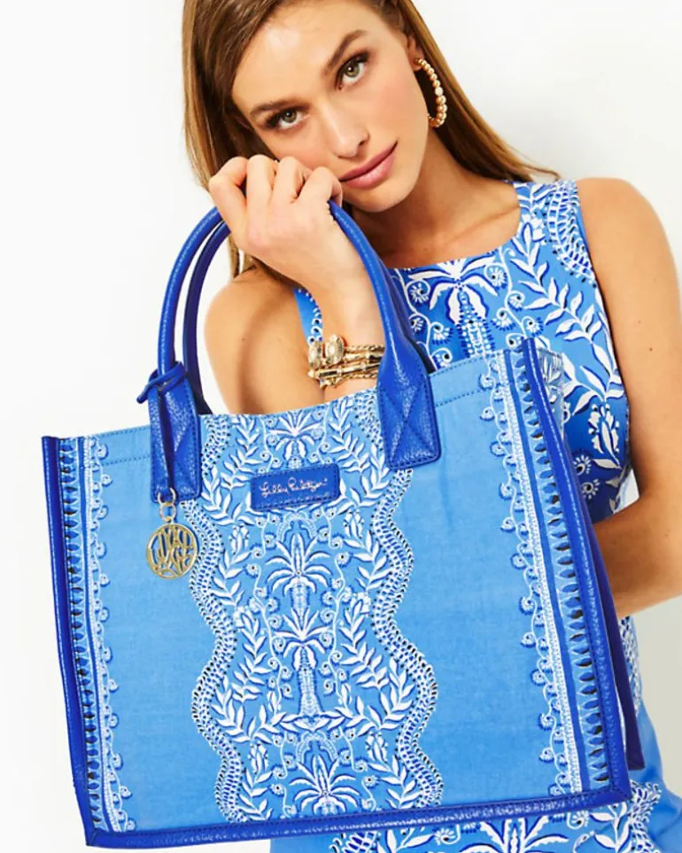 - Engineered Printed Canvas Twill Book Tote With Magnetic Snap Closure And Hanging Logo Charm.
