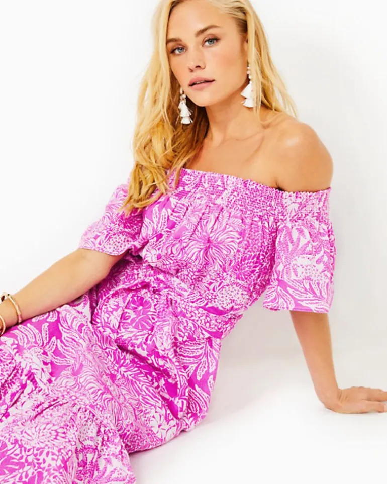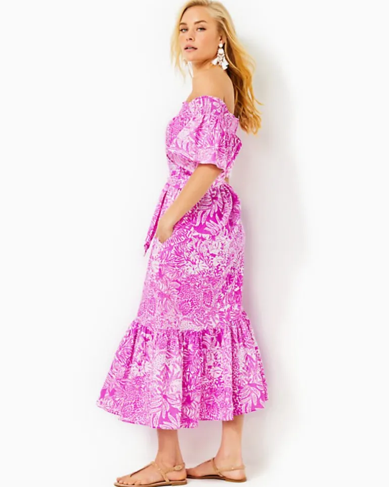 - Easy Fit, Off-The-Shoulder Midi Dress With Skirt Hem Ruffle And Side Seam Pockets.