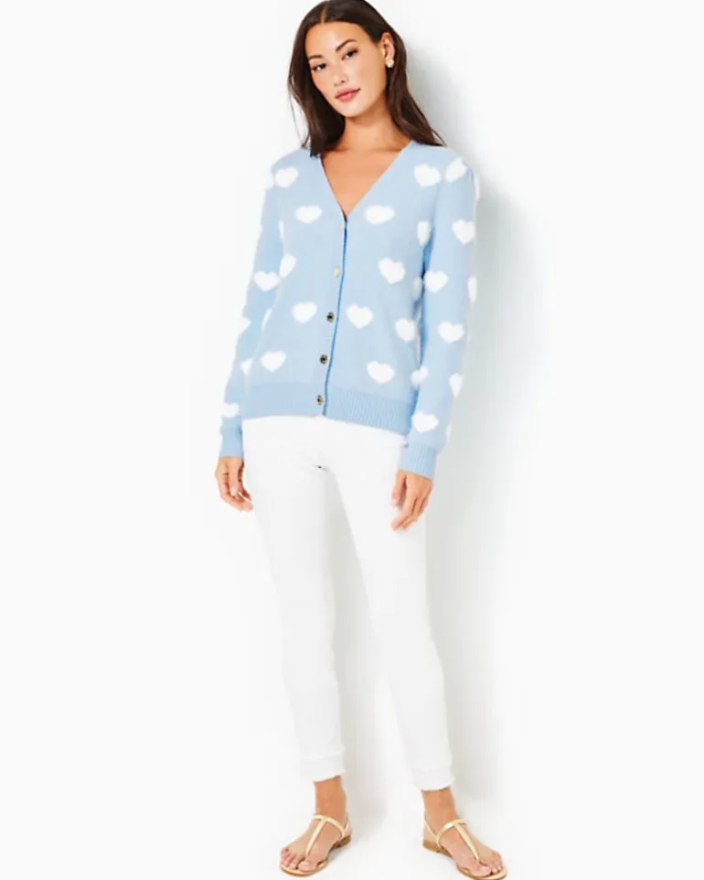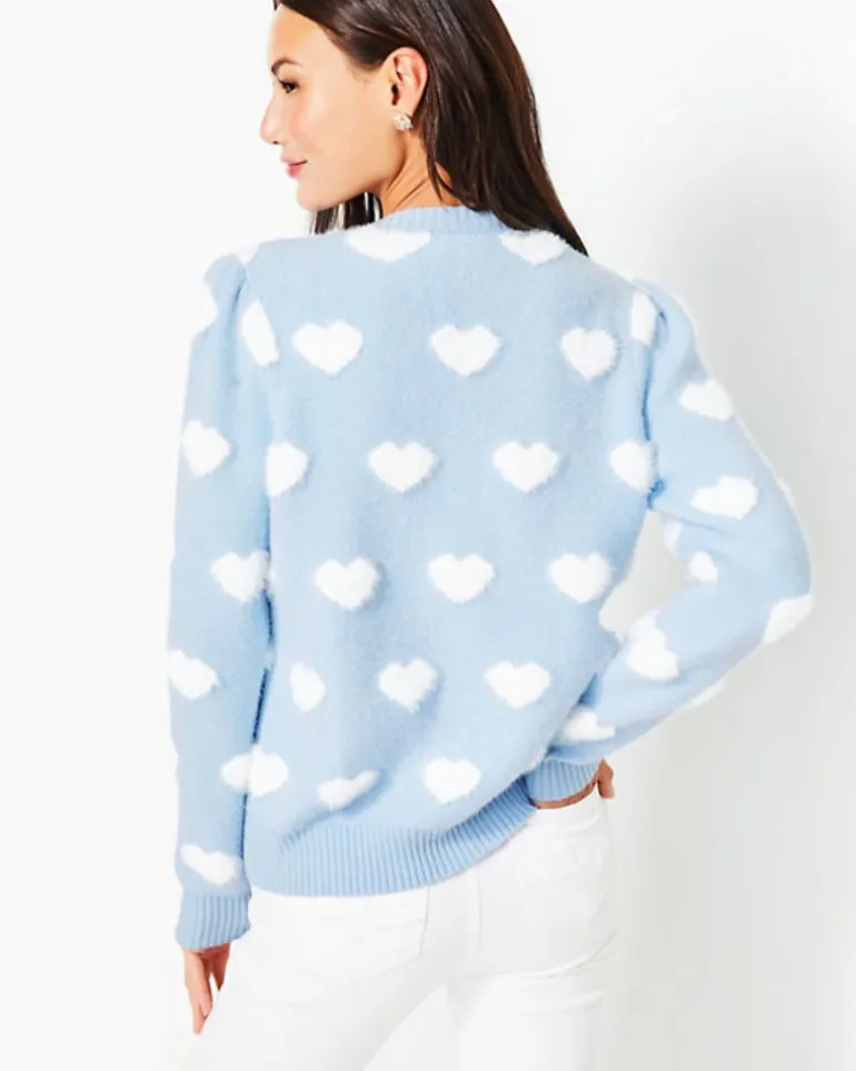 Novelty Heart Jacquard Makes Our Keane Cardigan The Season’S Sweetest Sweater. This Puff Sleeve Style Features A Classic V-Neckline And Button Front.