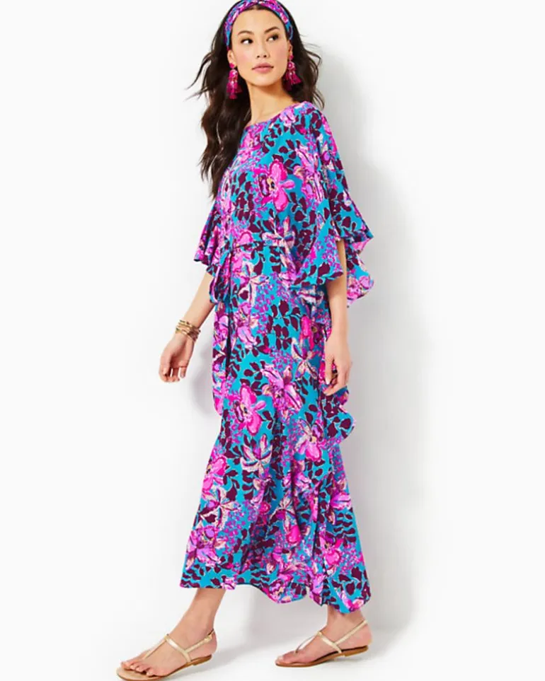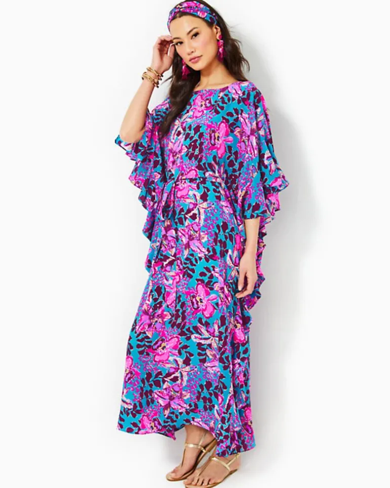 Flouce Sleeve Details Add Graceful Movement To The Monnae Silk Caftan, A Maxi Length Design In A Lush Allover Print. Wear This Airy, Easy Fit Style With The Included Jersey Slip, Or Layer It Over A Swimsuit For The Ultimate Poolside Chic Look.
