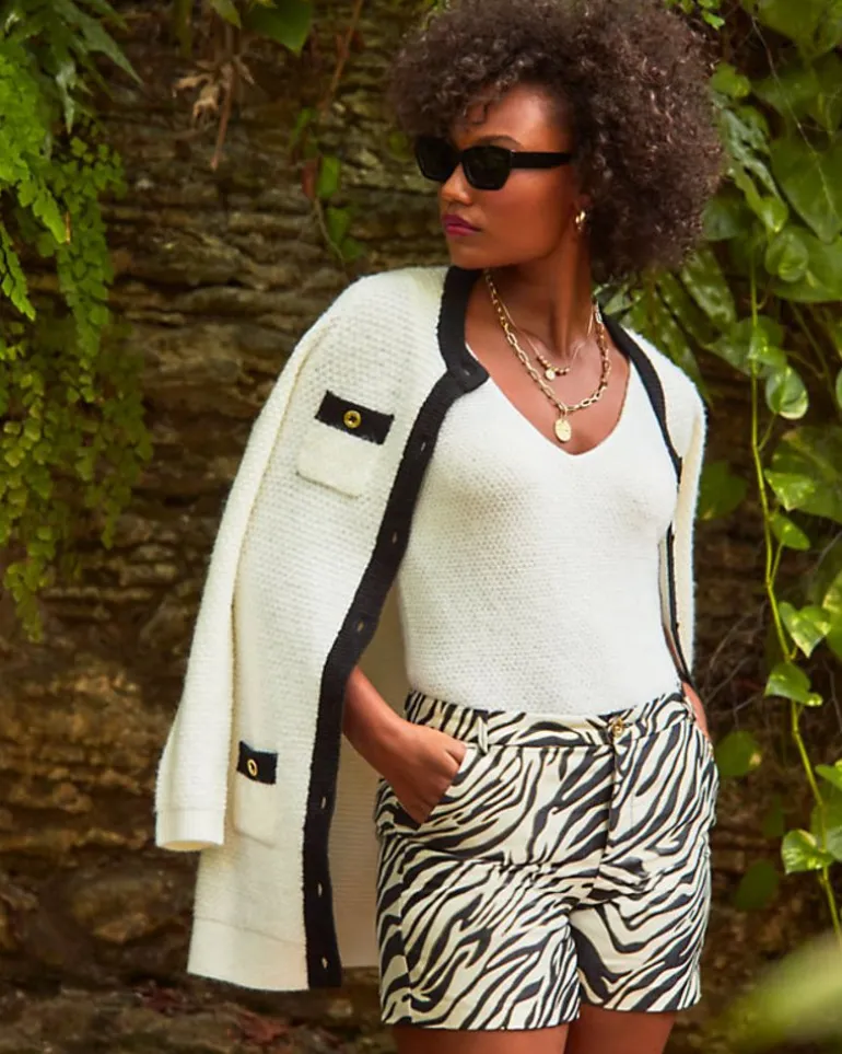Our Gretchen Short Is A Wardrobe Staple Thanks To A Streamlined Silhouette, High Rise, And 5″ Inseam. Zebra Jacquard Fabric Adds A Chic Twist.