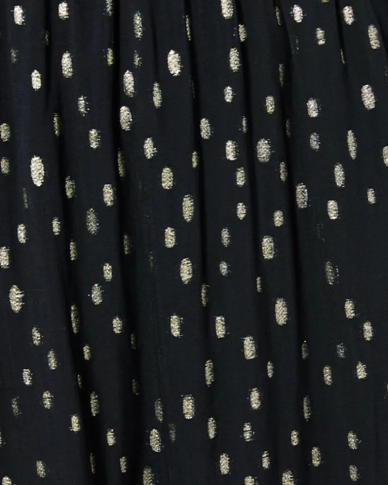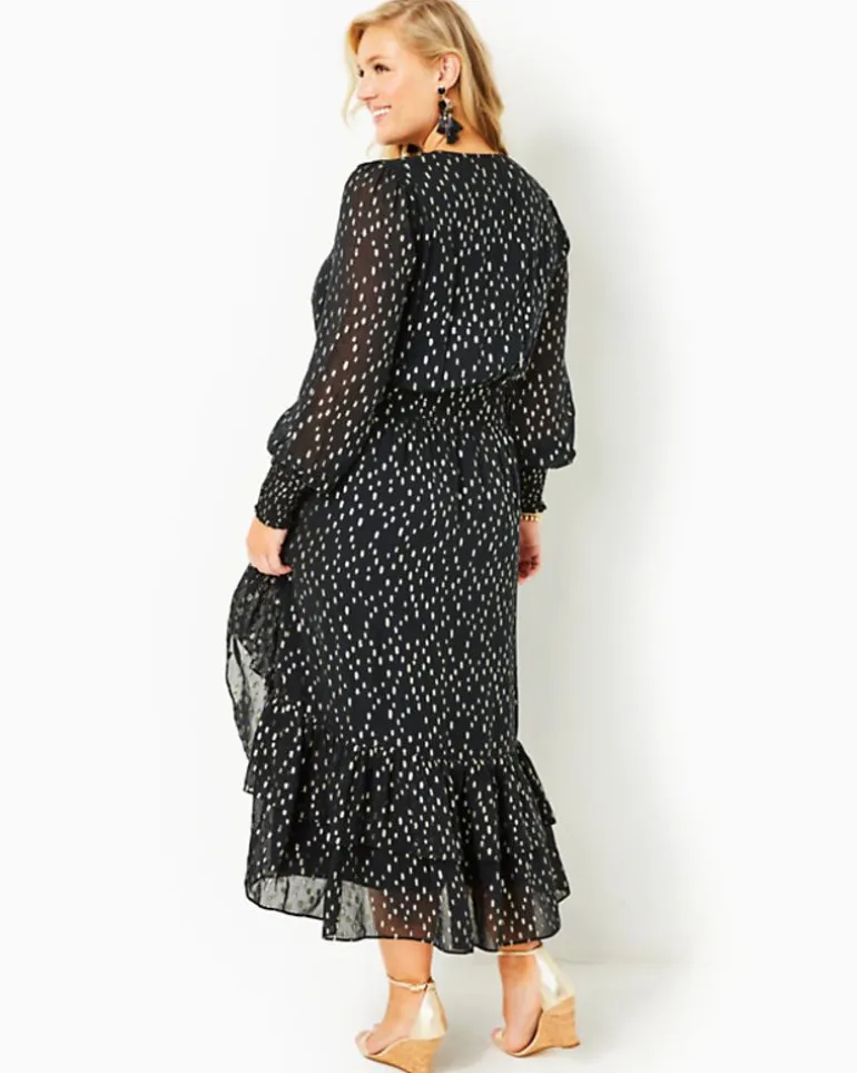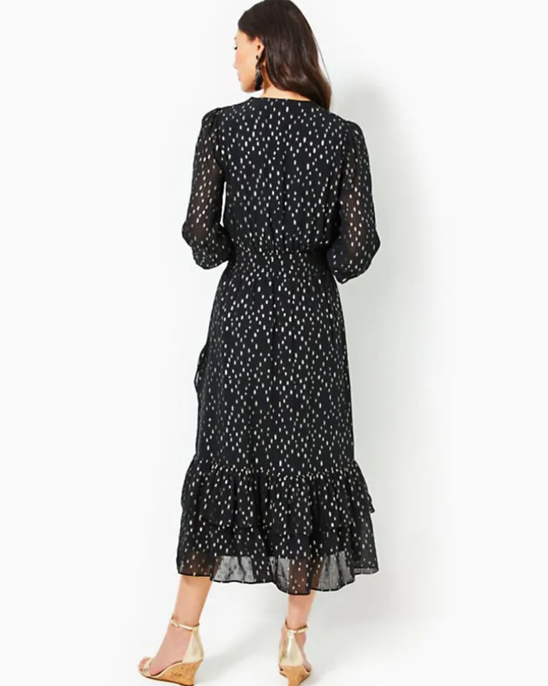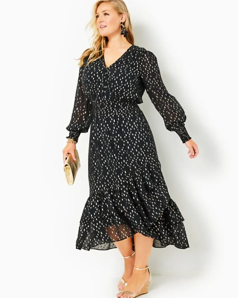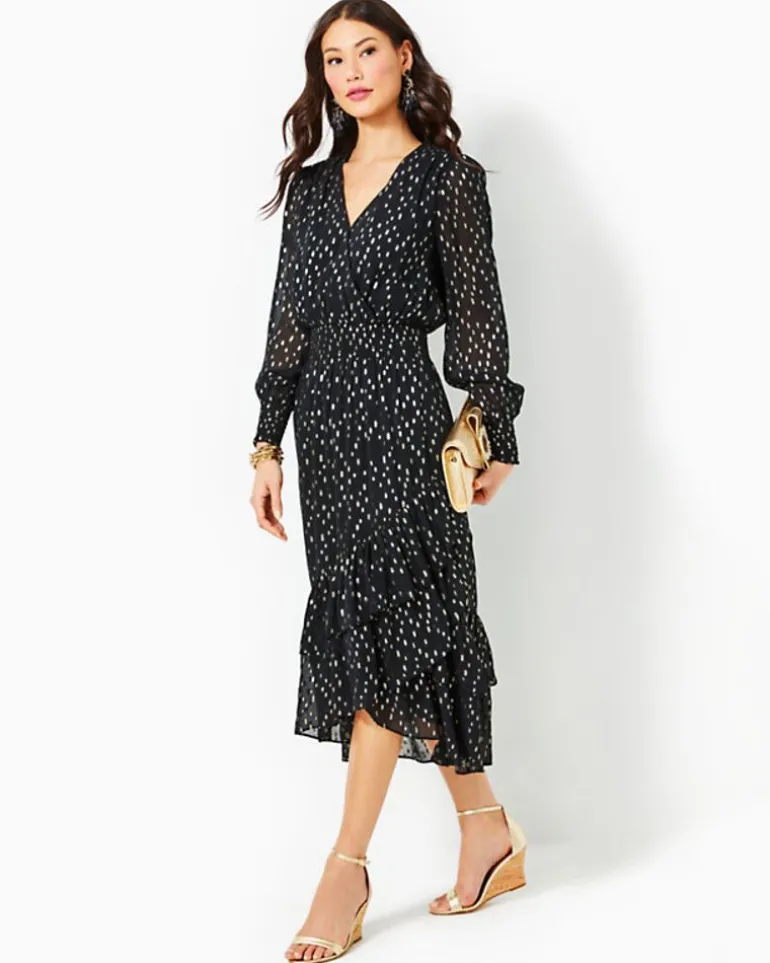 A Ruffled Skirt Makes Our Cristiana Midi Dress The Season’S Most Romantic Social Style. Shimmering With Metallic Details, This Easy Fit Midi Offers A Surplice Neckline And Long Sleeves With Smocked Cuffs.