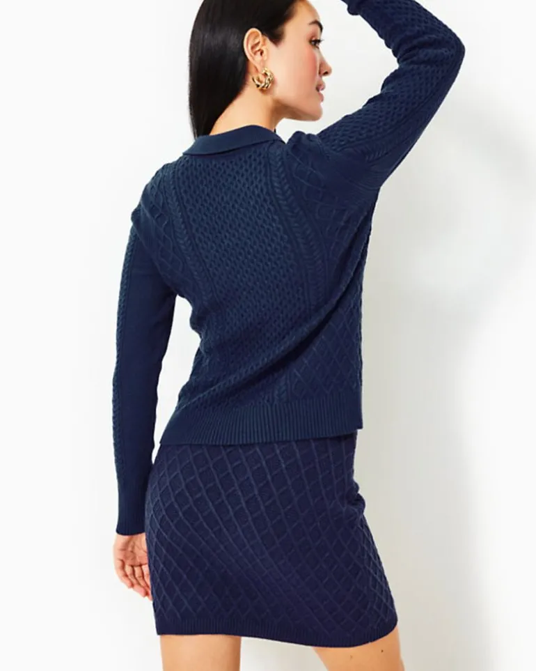 Warm Up With The Lizona Polo Sweater. This Straight Fit, Long Sleeve Polo Has A Classic Cable Stitch Design And Features A Stylish Front Button Placket With Two Buttons For A Timeless And Cozy Look. Get “Set” By Pairing It With The Lizona Cabled Sweater Skirt.