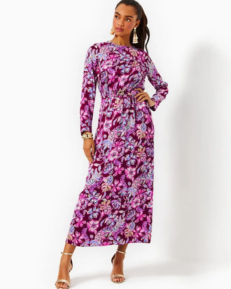 - Straight Fit, Crewneck Maxi Dress With Button Detail At Shoulder, Elastic At Waist, Long Slim Sleeves, And A Separate Elastic Belt With A Gold Buckle.