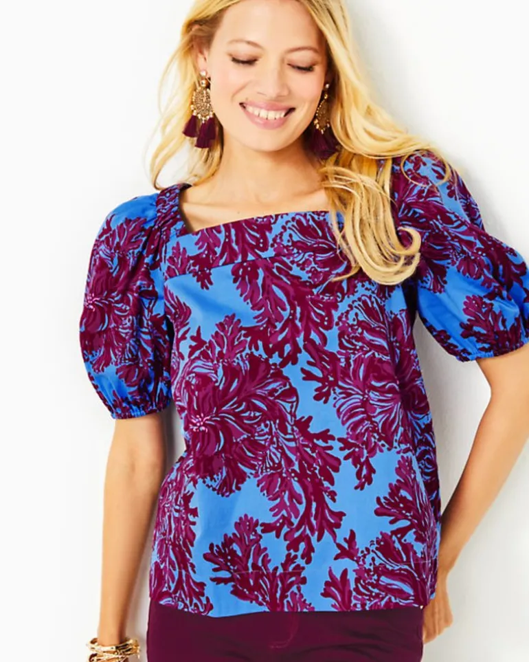 Printed Poplin Lends Crisp Texture And The Perfect Hint Of Stretch To The Torrey Top, An Easy Fit Style With A Square Neckline, Short Puff Sleeves, And A Tie Back.