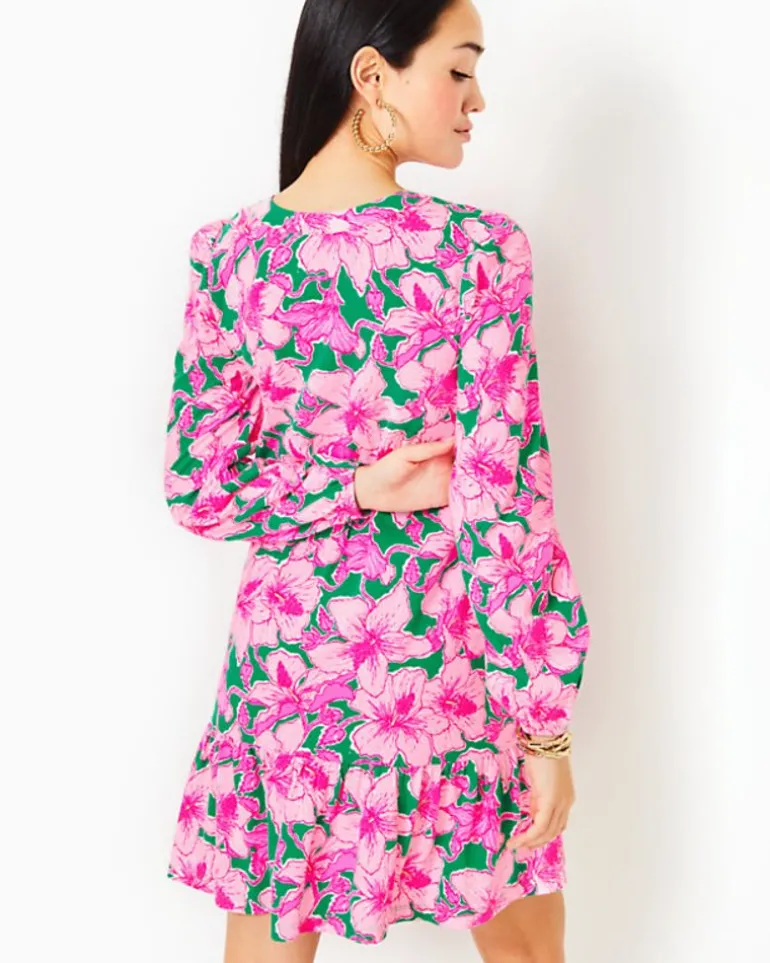 - Easy Fit, Long Sleeve Dress With A Notch Neckline, Placket, And Tall Ruffle At Hem.