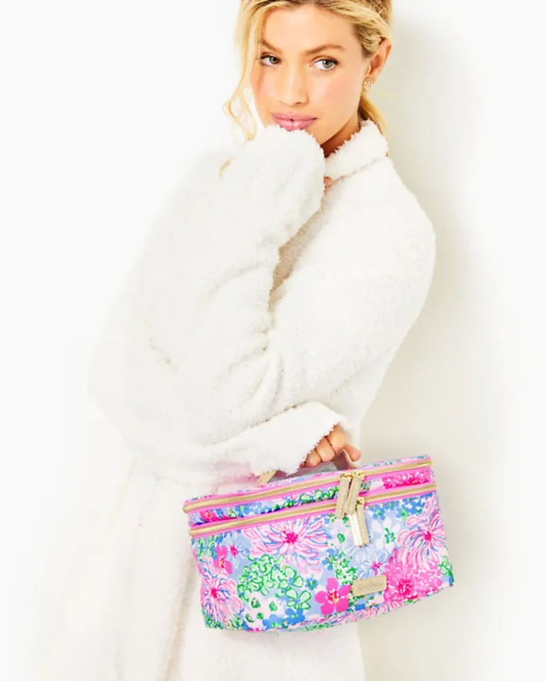 Take Your Beauty Routine On The Go With This Printed Cosmetic Case, Featuring Double Zip Compartments And A Convenient Handle For Carrying.