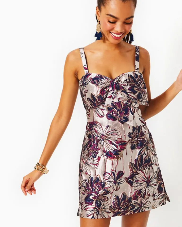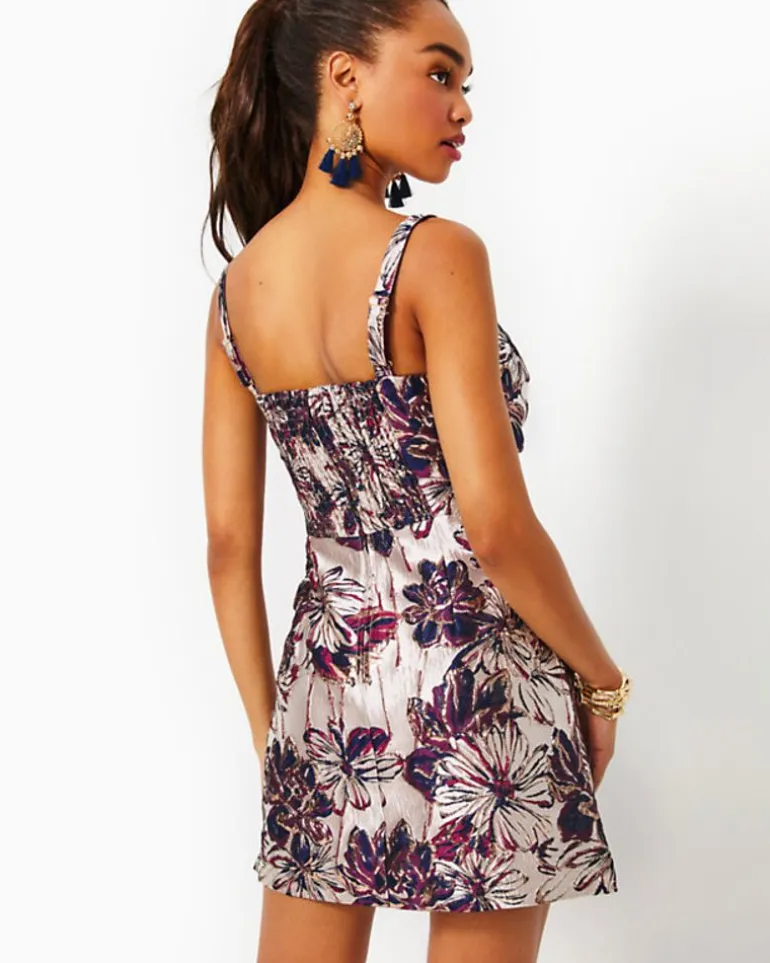 Opulent In Floral Brocade, The Kavia Romper Is A Skirted Style With Slender Straps And A Twist Detail At The Fitted Bodice.