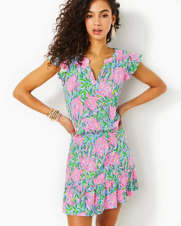 This Bright And Breezy Jersey Romper Is Sure To Be Your Favorite Summer Companion. The Ravi Romper Features A Flutter Sleeve Top With A Center Front Placket, A Comfy Smocked Waistband, And A Short Skirted Bottom With A Flounce Hem.