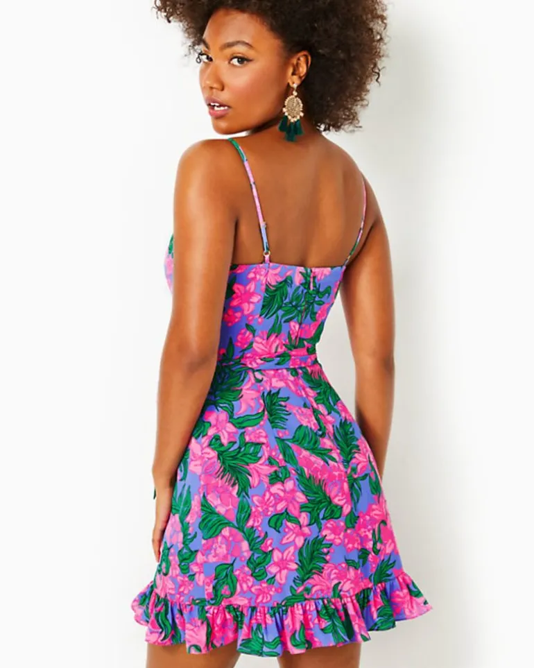 - Fit-And-Flare, Strappy Dress With Wrap Skirt And Hem Ruffle.