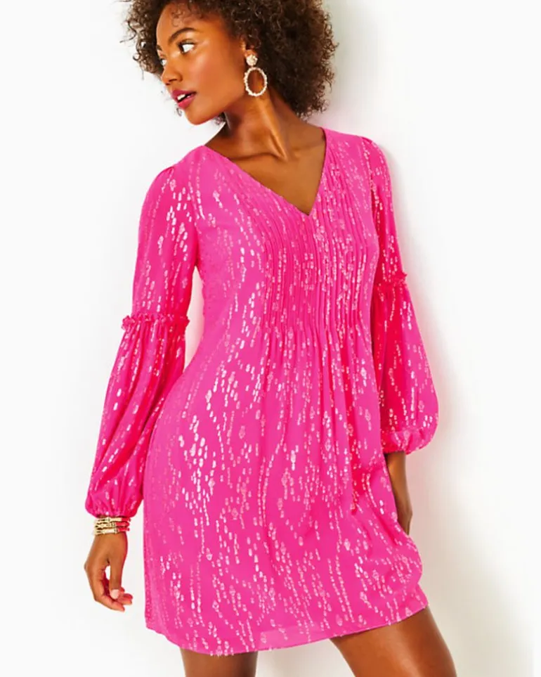 Effortless Style Meets Party-Ready Glamour In The Cleme Dress. Dusted With Metallic Details, This Silk Chiffon Dress Offers An Easy Silhouette With Full Sleeves And A V-Neckline Trimmed In Ruffles And Pintucks.