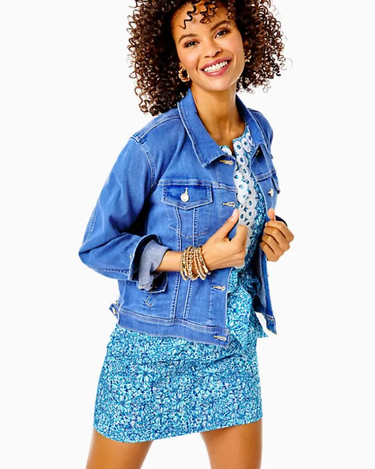 A Quintessentially Lilly Version Of The Classic Jean Jacket, Our Seaspray Denim Jacket Is The Perfect All-Season Layering Piece. Gold Logo Shanks Add Our Signature Detail To This Closet Staple.