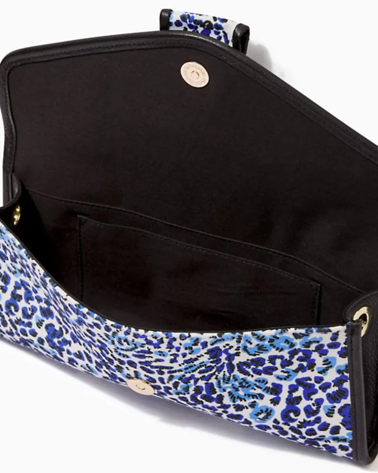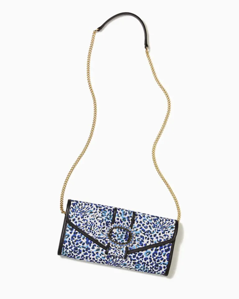 A Glittering Embellished Buckle Tops Off The Benton Clutch, A Chic Design In Printed Sateen With A Detachable Gold Chain Strap.