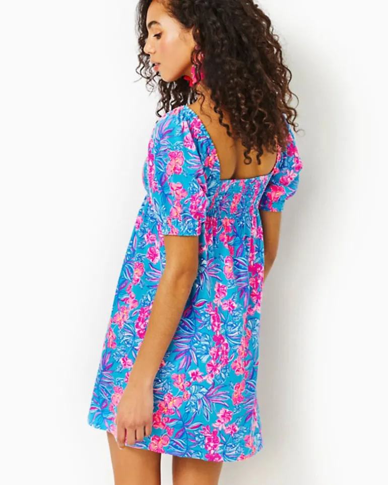- Fit-And-Flare Sundress With An Empire Waist, Interior Bodice Cups, Short Puff Sleeves, And Smocked Back Panel.