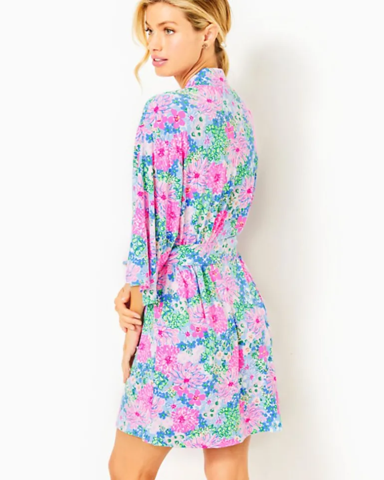 - Above-The-Knee Robe With 3/4 Length Kimono Sleeves, Banded Neckline, Patch Pocket, And A Tie Sash Detail.