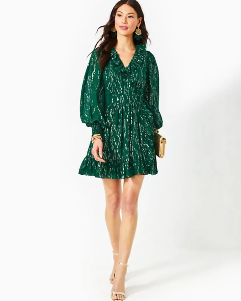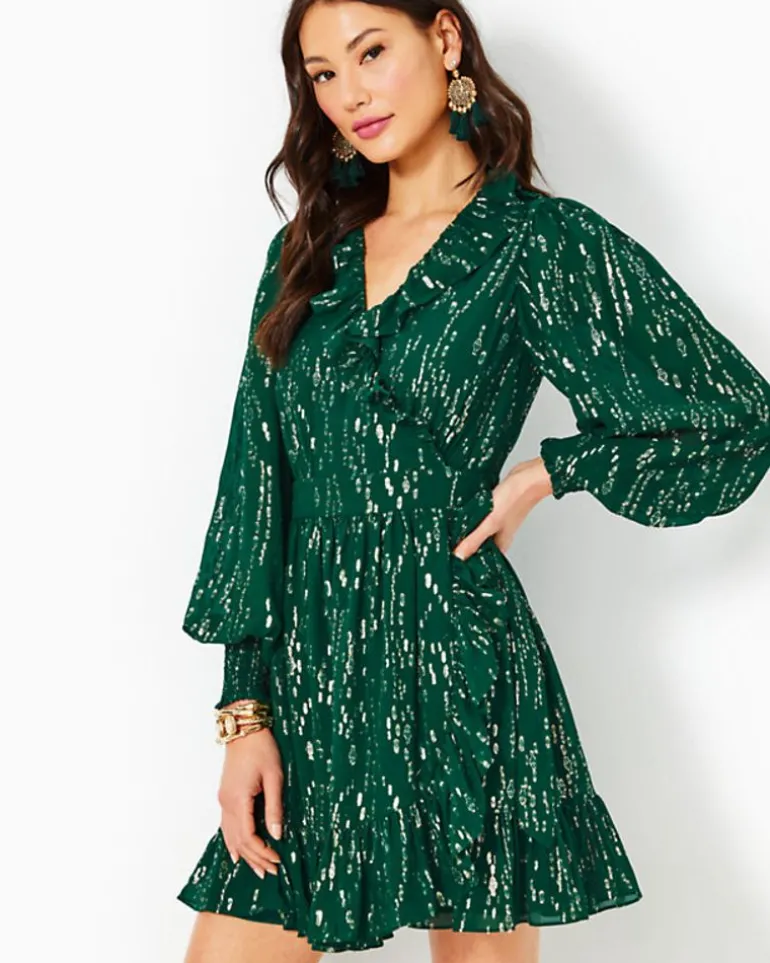 Made From Airy Chiffon And Dusted With Metallic Details, The Birdy Dress Is A Social Showstopper. This Silk Wrap Dress Features A Surplice Neckline Trimmed In Ruffles, Plus Long Sleeves With Smocked Cuffs And A Ruffle Hem Skirt.