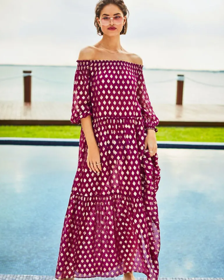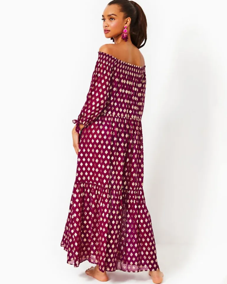 Make A Stylish Statement Poolside In The Dayla Maxi Cover-Up, A Flowy Design Decked Out With Metallic Touches. This Full-Length Cover-Up Features An Off-The-Shoulder Neckline, Ruffled Flounces, And Smocked Detailing.