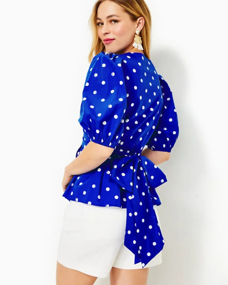 A Timeless Wrap Silhouette And Crisp Cotton Poplin Fabric Make Our Kara Top A Closet Staple. A Waist Tie And Elbow-Length Puff Sleeves Complete The Look.