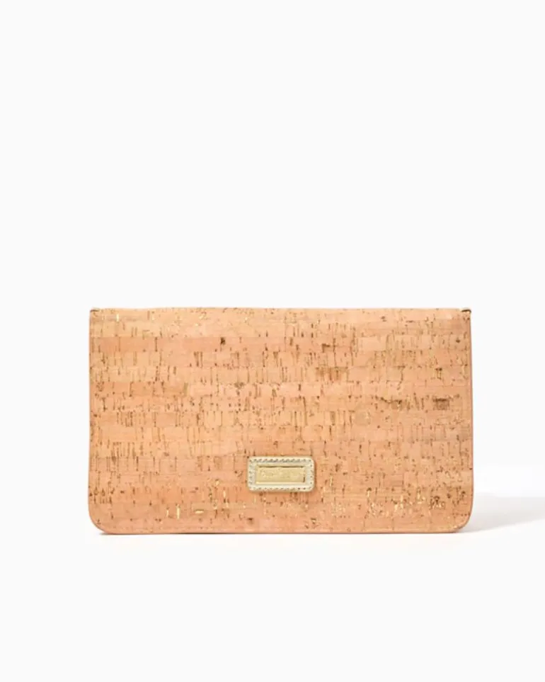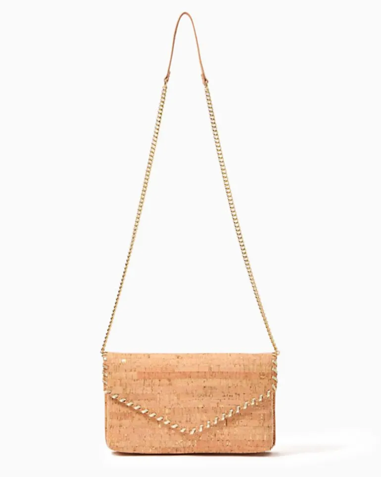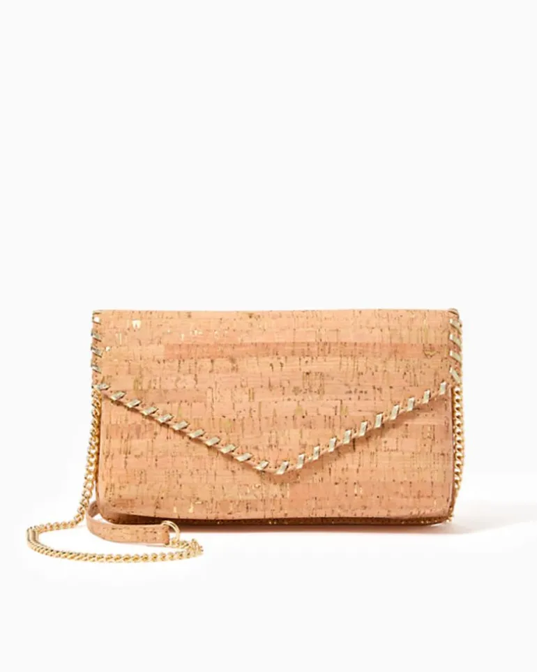 - Metallic Cork Clutch With Whipstitched Embroidery And Detachable Gold Metal Chain Crossbody.