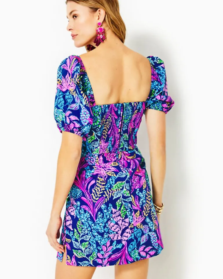 Made From Printed Poplin With A Hint Of Stretch, The Morena Romper Is A Skirted Style With Short Puff Sleeves, A Sweetheart Neckline, And A Smocked Back.