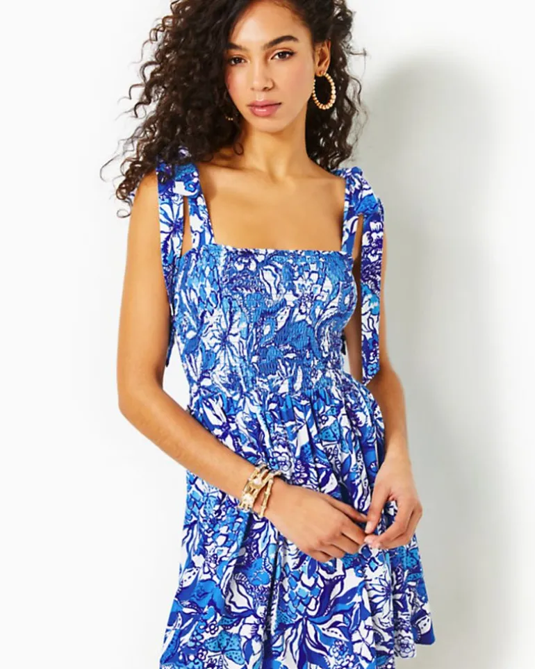 Slip Into Summer’S Brightest And Breeziest Outfit With Our Rivera Romper. This Skirted Jersey Style Features A Smocked Bodice And Functional Tie Straps, Splashed With A Vibrant Lilly Print.