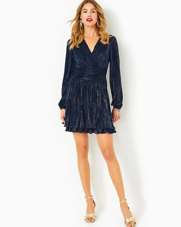 Step Into Our Jessamie Long Sleeve Dress. This Fit And Flare Masterpiece Has A Surplice Bodice, A Flattering Wide Waistband, And A Tiered Skirt, Making It The Perfect Choice For A Night Out.
