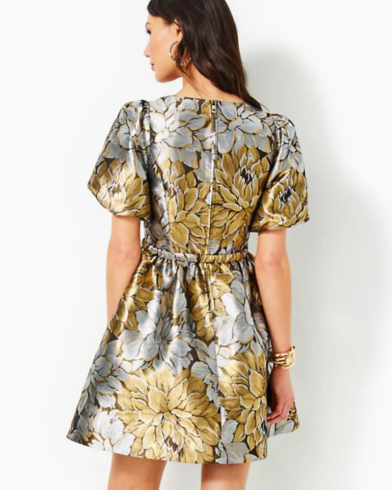 Richly Detailed Floral Brocade Makes The Priyanka Dress A Social Standout. This Fit-And-Flare Dress Features Short Puff Sleeves, A Separate Sash, And Side Seam Pockets.