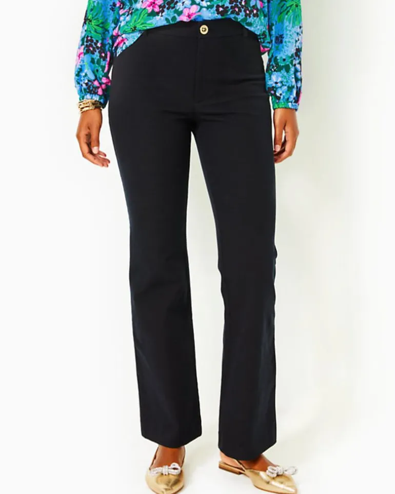 - High Rise, Fly Front, Straight Fit, Bi-Stretch Flare Pant. Interior Waistband With Elastic Construction For Added Comfort.