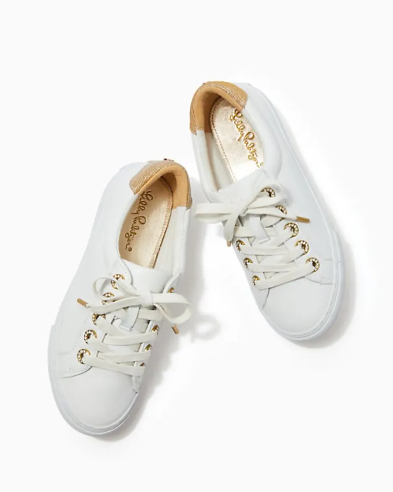 - Leather Lace Up Sneaker With Gold Metallic And Pave Rhinestone Accents.